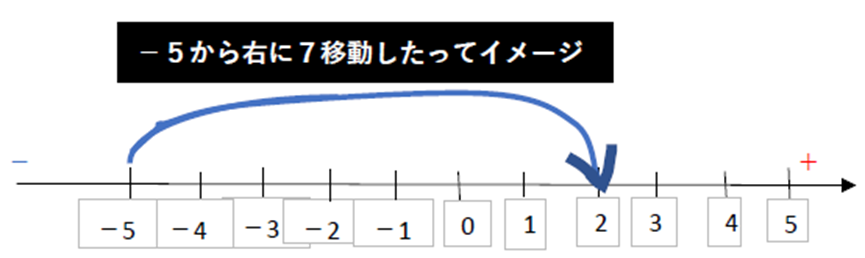 まず、数式に沿ってみてみると、-5がスタート地点です。そこから+7なので右に(+の方向に)7移動したというイメージになります。